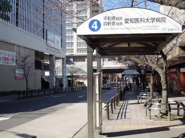 藤が丘駅からは「愛知医科大学病院」行きの名鉄バス(4番のりば)を利用します。駅から大学まで、バスで約15分です。