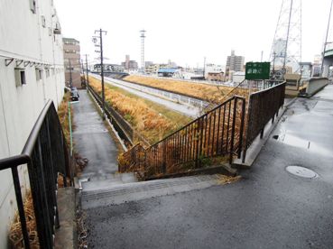 バス停から徒歩で来た場合は、地蔵川と住友倉庫の間の階段を利用すると便利です。