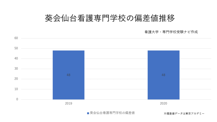 2019年、2020年と偏差値48で変化はありません。宮城県の看護専門学校で偏差値40台の学校は葵会仙台看護専門学校のみで他の5校は50台です。