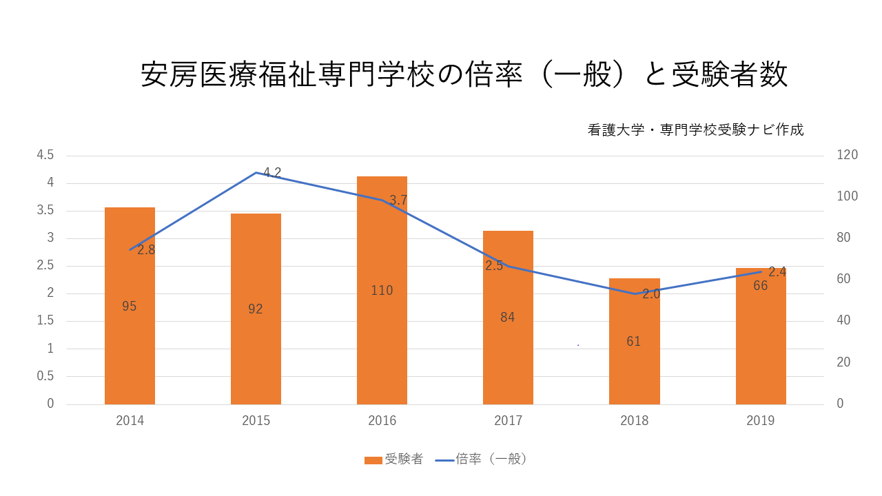 それでは、安房医療福祉専門学校が開校した2014年の一般倍率をみてみると、倍率2.8倍、受験者数95名のスタートでした。その後、倍率が一番上昇したのは開校の翌年の2015年で4.2倍、受験数が一番多かった年は2016年で110名です。一方、倍率、受験数ともに一番低かったのが2018年で、2.0倍、受験者数61名でした。