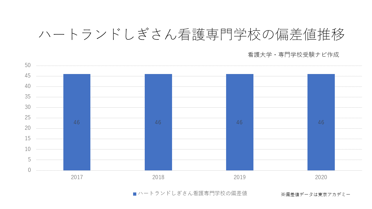 ハートランドしぎさん看護専門学校の偏差値は46となっています。この偏差値は50%の合格可能性を示しています。
