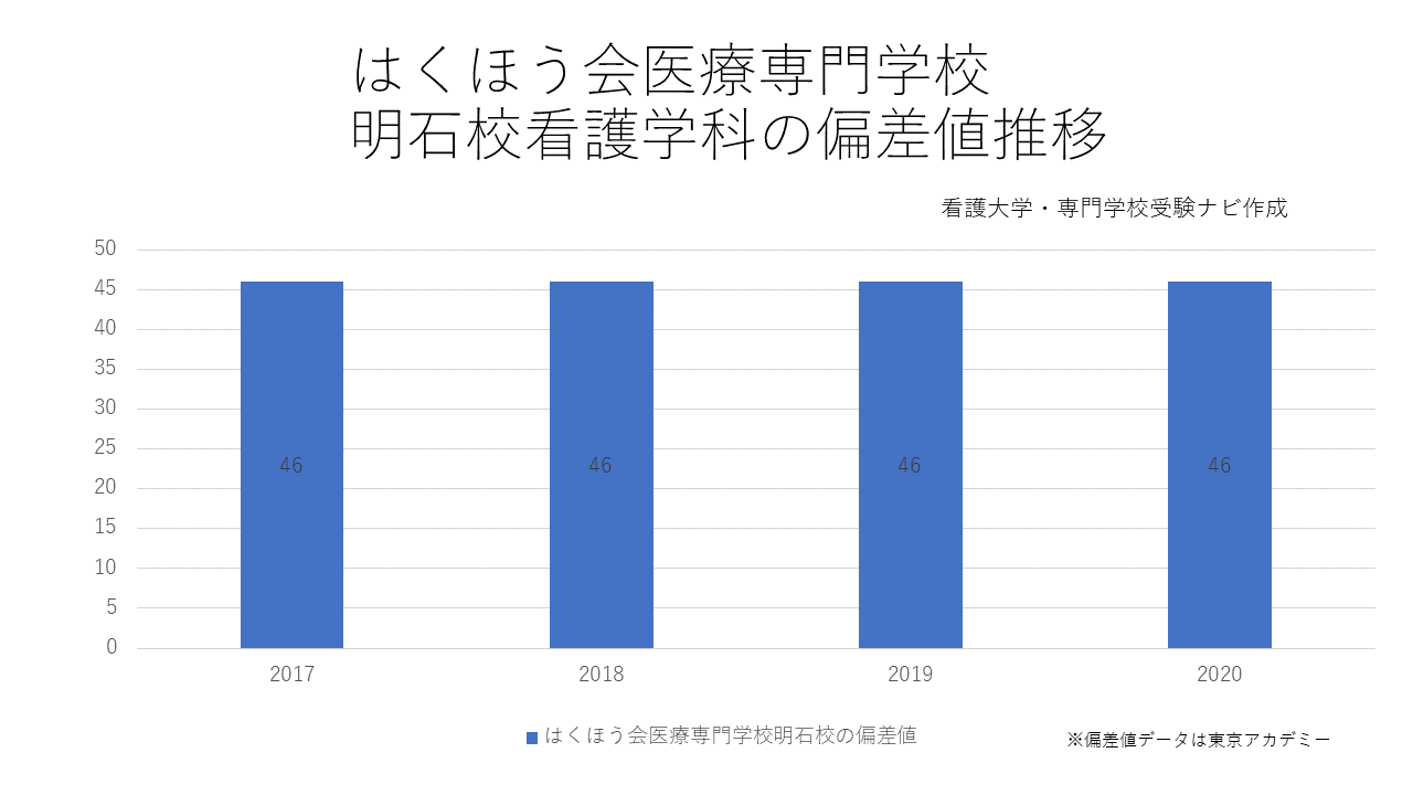 はくほう会医療専門学校明石校の偏差値は46となっています。この偏差値は50%の合格可能性を示しています。