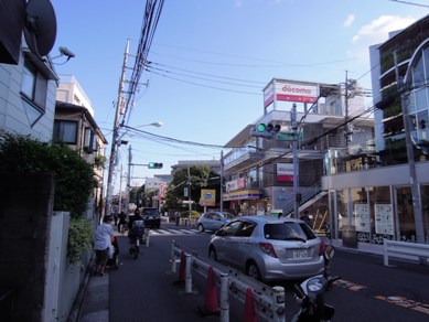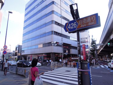 少し歩くと「駒沢大学駅前」の交差点に出ます。横断歩道は渡らないで、手前で左折します。都道426号線(通称:自由通り)沿いを行きます。