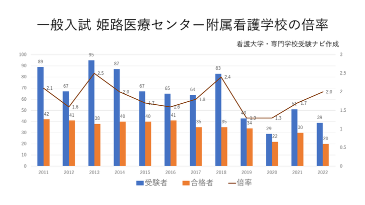 姫路医療センター附属看護学校の倍率は2.0倍です(2022年度・一般入試)。