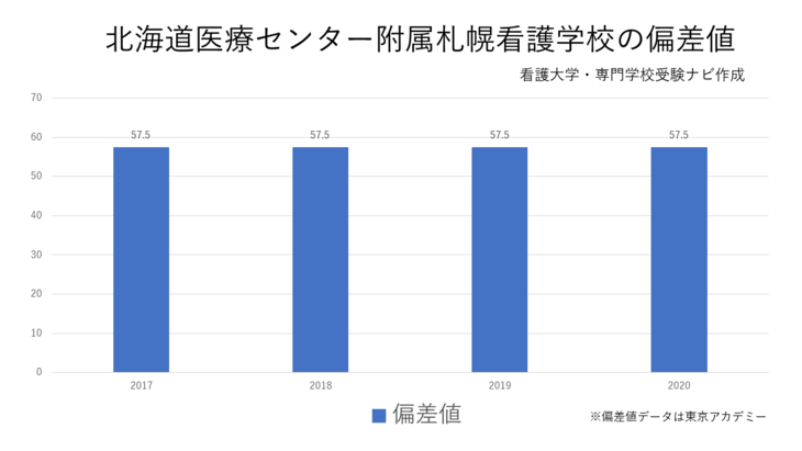 北海道医療センター附属札幌看護学校の偏差値は57.5となっています。この偏差値は50%の合格可能性を示しています。