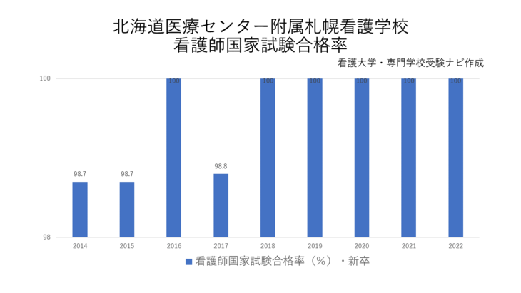 北海道医療センター附属札幌看護学校の看護師国家試験合格率は98.7%(受験者76名、合格者75名、2023年2月実施・新卒)。