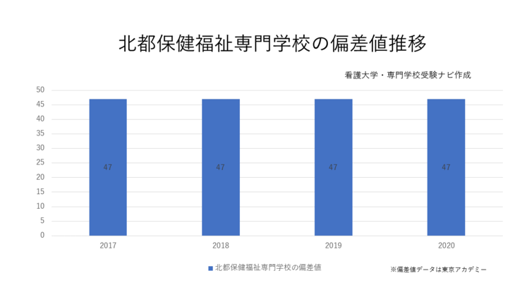 北都保健福祉専門学校の偏差値は47となっています。この偏差値は50%の合格可能性を示しています。