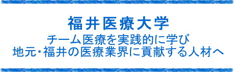 福井医療大学では、前身となる福井医療短期大学、さらに福井医療技術専門学校からの伝統を引き継いだ教育を展開。現在、医療の現場で求められる「コ・メディカルスタッフ」(病院の診療補助部門職員)を育成するため、医療、福祉をはじめ社会情勢の変化および学問の進歩に対応した質の高い教育を目的としています。