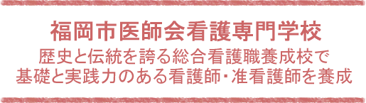 本校は「一般社団法人福岡市医師会」によって設立された歴史と伝統のある看護師養成専門学校です。3年間で看護師の国家資格を目指すコースと、看護補助者として医療施設に就業しながらまず准看護師の資格を取得するコース、その後に看護師を目指すことを目的とした進学コースを併設しています。