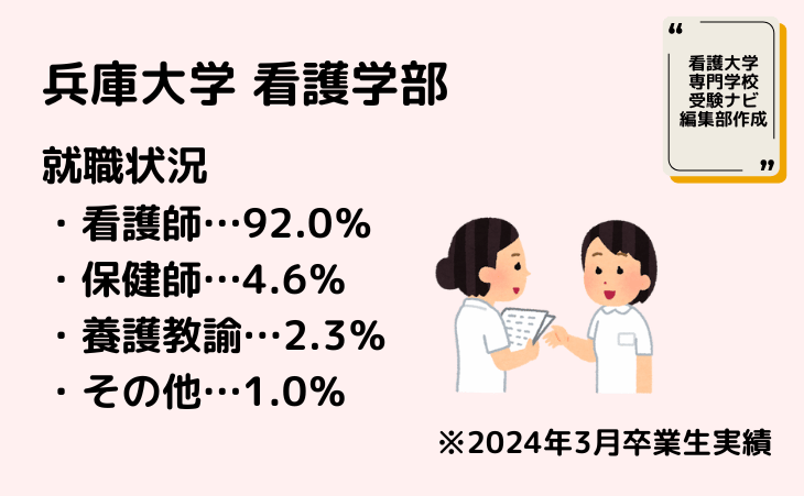 兵庫大学の看護師国家試験合格率は94.4%(受験者89名、合格者84名、2024年2月実施・新卒)。