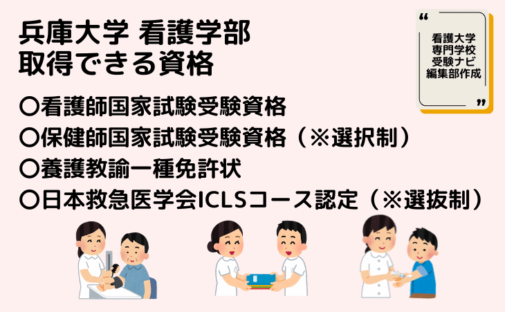 資格取得の面でも、本学部は充実したサポート体制を整えています。学生たちは、看護師、保健師(※選択制)、養護教諭一種、さらには日本救急医学会ICLS(Immediate Cardiac Life Support)コース認定資格(※選抜制)など、最大4つの資格を取得する機会があります。