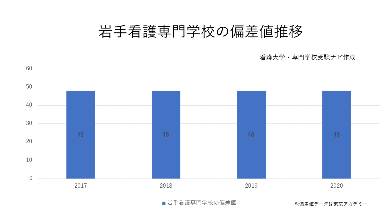 岩手看護専門学校の偏差値は48となっています。この偏差値は50%の合格可能性を示しています。