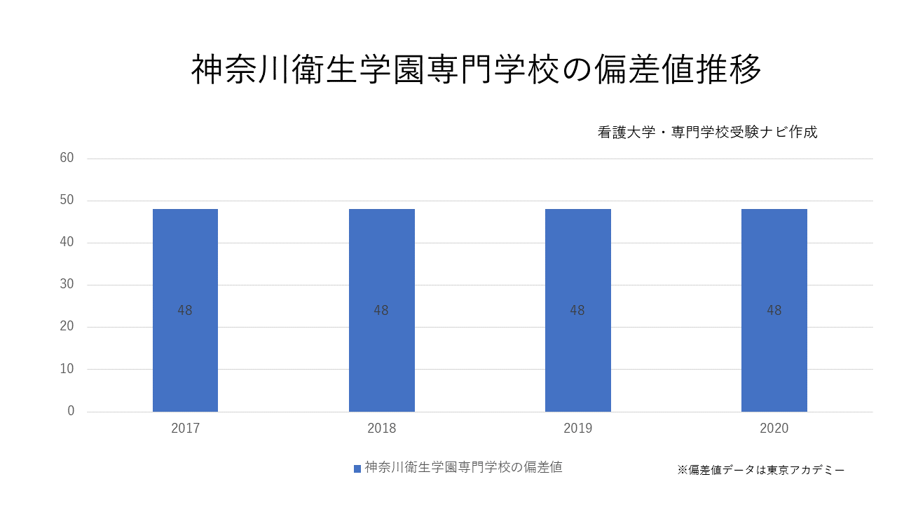 神奈川衛生学園専門学校の偏差値は48となっています。この偏差値は50%の合格可能性を示しています。