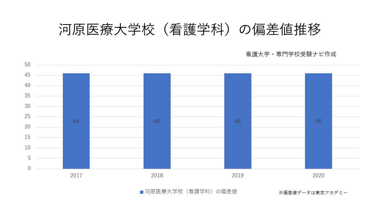 2017年~2020年までの偏差値は46で変化はありません。愛媛県の看護専門学校で河原医療大学校と同じ偏差値の学校はありませんでした(2020年偏差値データ)。