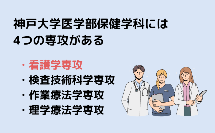 ・神戸大学医学部保健学科は4つの専攻があります(看護学、検査技術科学、理学療法学、作業療法学)