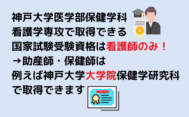 神戸大学の看護学専攻で取れる国家試験受験資格は看護師だけなので、助産師や保健師の資格を取るために大学院などに進学する人も少なくないのでしょう。