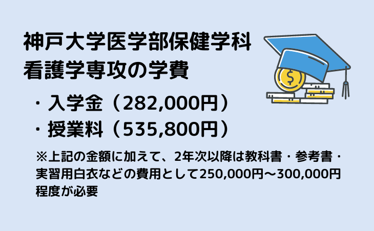 神戸大学医学部保健学科看護学専攻の学費は817,800円(初年度納入金)、2~4年次は年額535,800円、4年間の学費総額は2,425,200円となります。