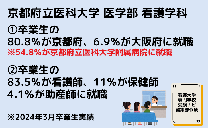 看護学科の卒業生の約80%が京都府、約7%が大阪府、半数以上(54.8%)が京都府立医科大学附属病院に就職しています。