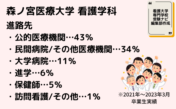 進路先としては「公的医療機関」が43%でトップ、次に「民間病院・その他医療機関」が34%、「大学病院」が11%、「進学」が6%、「保健師」が5%、「訪問看護・その他」が1%です。
