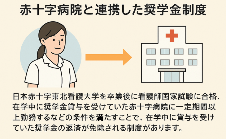 日本赤十字東北看護大学では、学生の経済的負担を軽減し、卒業後の進路支援にもつながる制度として、全国の赤十字病院と連携した奨学金制度を設けています。この制度では、在学中に希望する赤十字病院から奨学金の貸与を受けることができ、卒業後に看護師国家試験に合格し、貸与を受けた赤十字病院で一定期間以上勤務するなど、所定の条件を満たした場合には、奨学金の返済が全額免除されます。