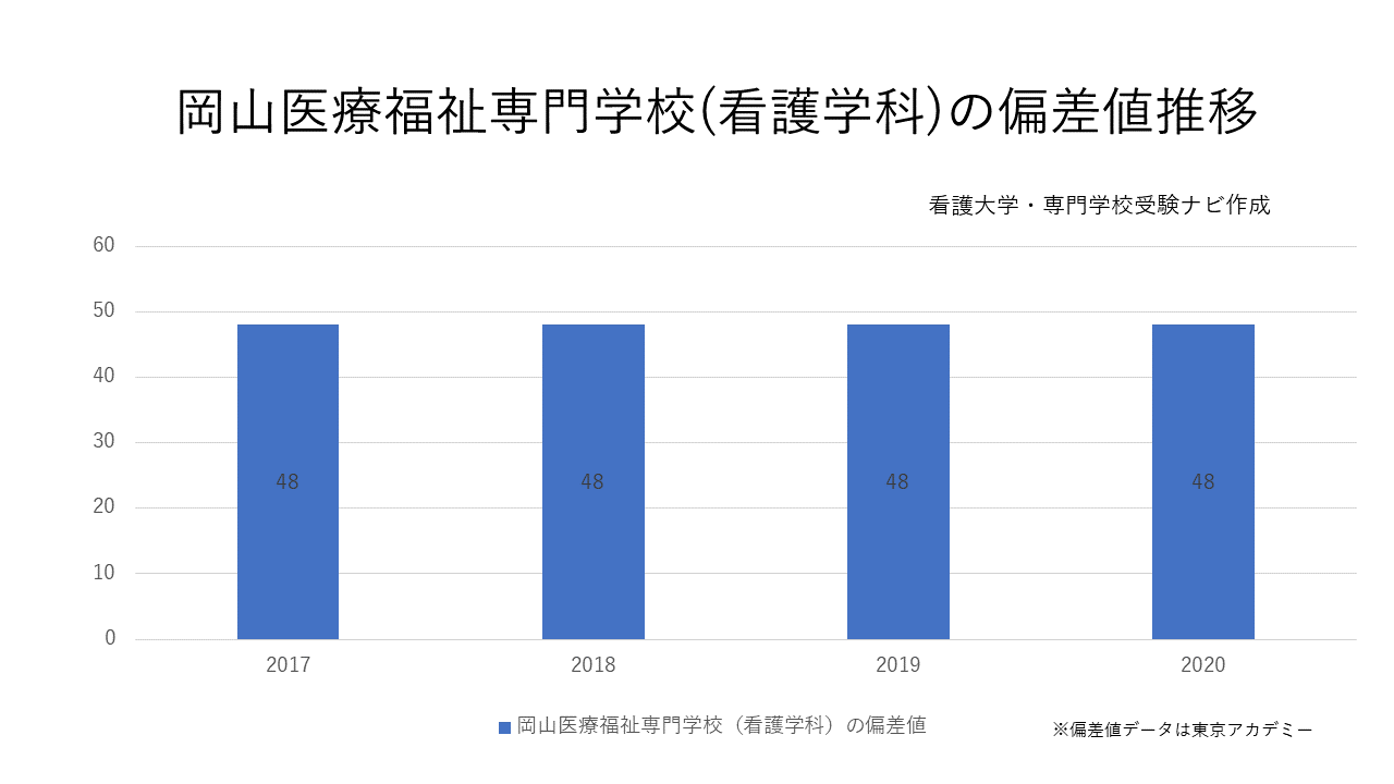 2017年から2020年まで偏差値48で変わりはありません。同じ岡山県の看護専門学校で偏差値48の看護専門学校はありませんでした(2020年偏差値データ)。