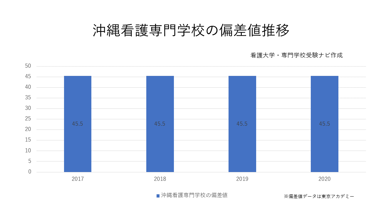 沖縄看護専門学校の偏差値は45.5となっています。この偏差値は50%の合格可能性を示しています。