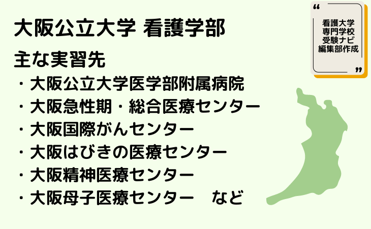 看護学部の主な実習先は阿倍野キャンパスの敷地内にある大阪公立大学医学部附属病院や大阪府立病院機構の5センターです。そのほか大阪府内の高齢者施設、訪問看護ステーション、地域包括支援センター、精神医療機関、保育園、学校などでも実習します。