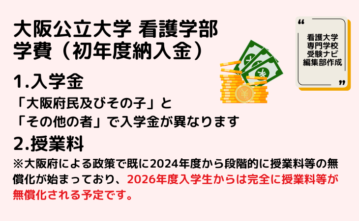 ただ大阪府による政策で既に2024年度から段階的に授業料等の無償化が始まっており、2026年度入学生からは完全に授業料等が無償化される予定です。