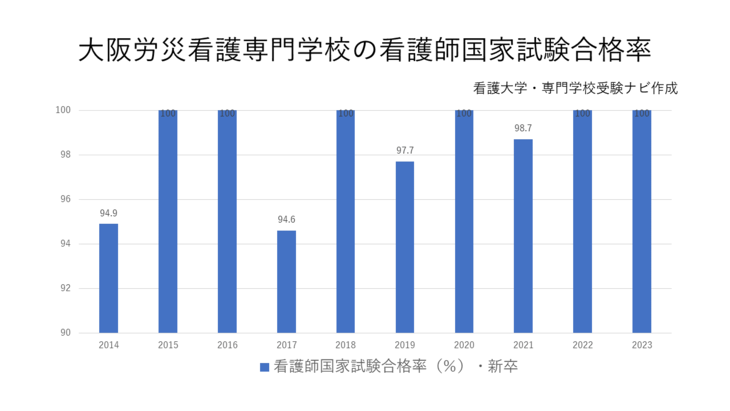 大阪労災看護専門学校の看護師国家試験合格率は100%(2023年2月実施・新卒) 。
