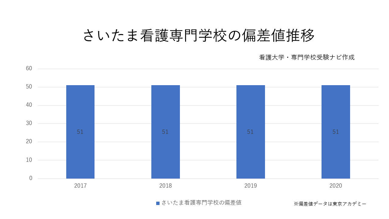 さいたま看護専門学校の偏差値は51となっています。この偏差値は50%の合格可能性を示しています。