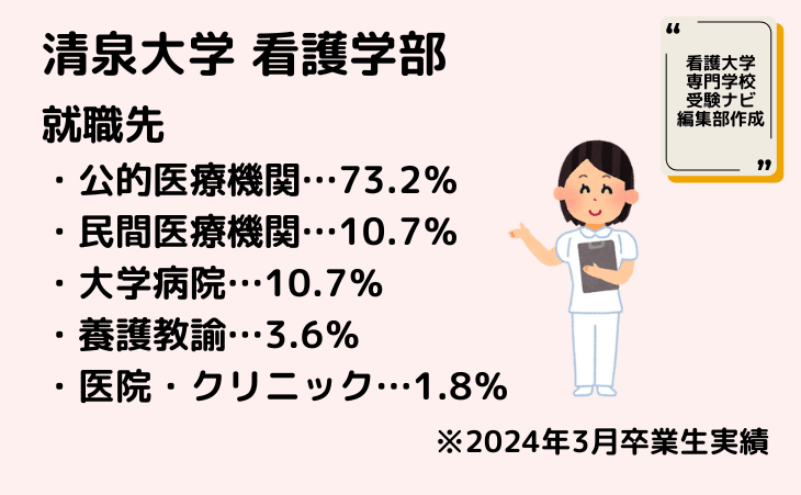 清泉大学看護学部の就職先で最も多いのは公的医療機関で73.2%、続いて同率2位(10.7%)で民間医療機関と大学病院、3位が養護教諭(3.6%)、4位が医院・クリニック(1.8%)。以上は2024年3月卒業生実績のデータに基づいています。