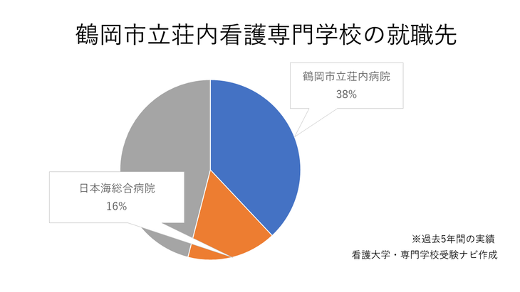 過去5年間で就職先で最も多いのは、学校の母体病院である「鶴岡市立荘内病院」(38%)で、2番目は「日本海総合病院」(16%)です。
