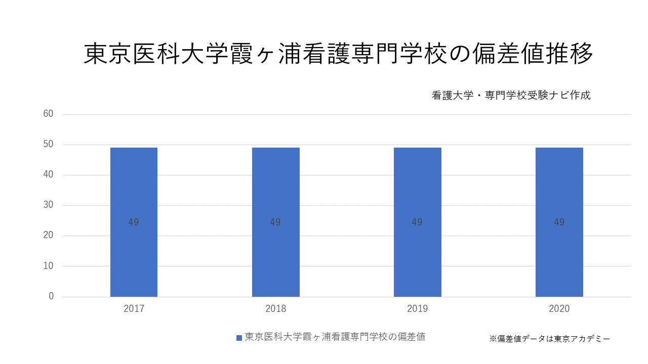 東京医科大学霞ヶ浦看護専門学校の偏差値は49となっています。この偏差値は50%の合格可能性を示しています