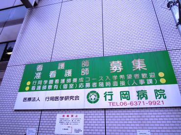 病院の外壁には看護師募集とともに看護師養成コース入学希望者を募集する告知が掲げられていました。